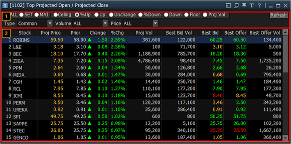 This is a screen that shows top projected stocks for 'Celling, %Up, Up, Unchange, %Down, Down, Floor, Proj Vol' based on simultaneous bid/offer. 'Projected price, base price, change, percent change, projected match volume, offer and bid’ of the stock are provided, viewing details of projected matching on a single screen.
