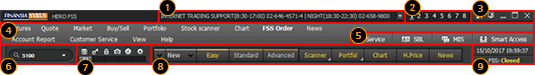 Finansia HERO HTS is divided into top menu bar, bottom ticker bar and screen view area in the middle where screens