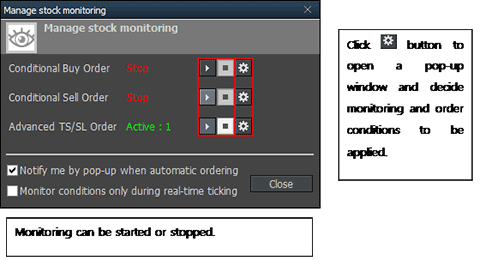button to open the ‘Management stock Monitoring’ pop-up window and configure Monitoring Start/Stop settings for Conditional Buy Order, Conditional Sell Order, etc.